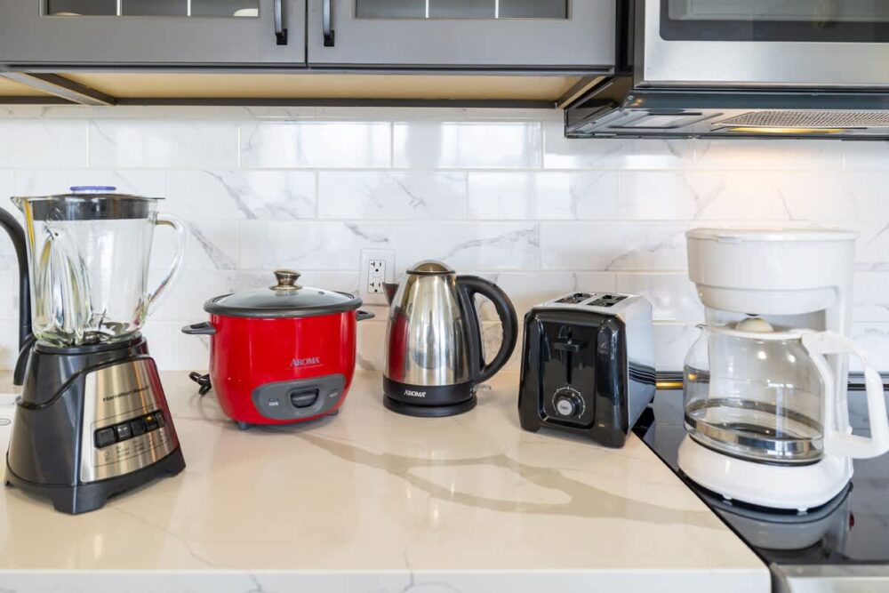 – Fully equipped with a toaster, coffee maker, rice cooker, blender, kettle, pots, pans, silverware, cookware, and dishes.