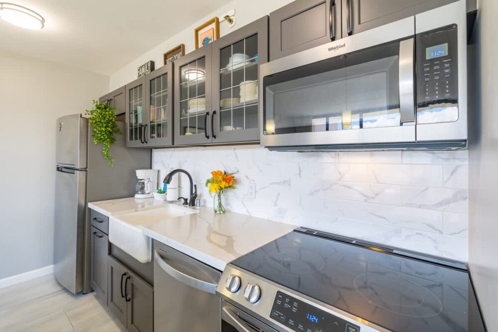 – Kitchen with full-size appliances: microwave, stove, refrigerator with freezer, and dishwasher.