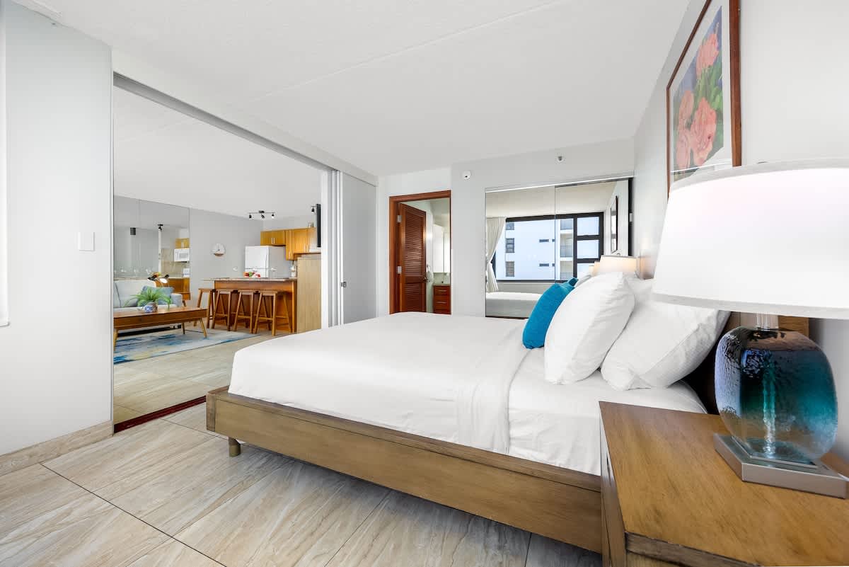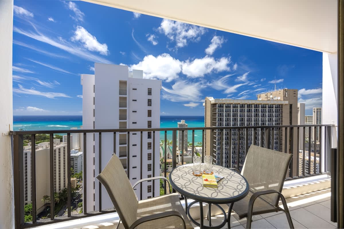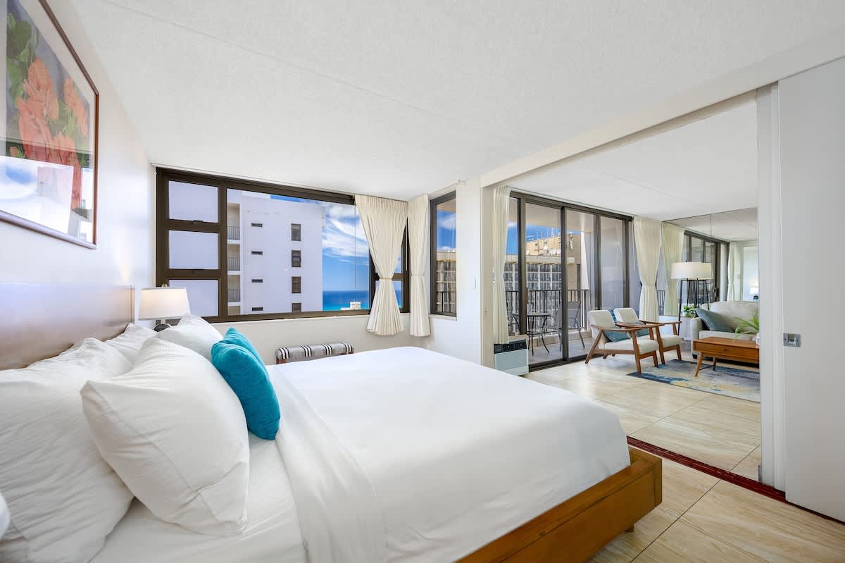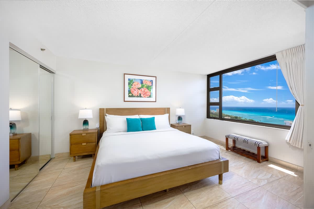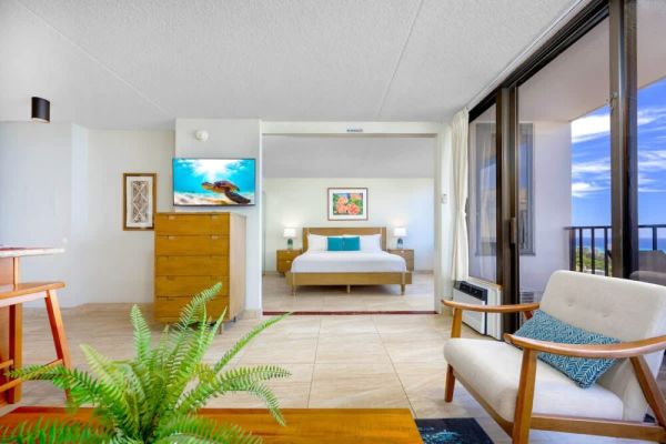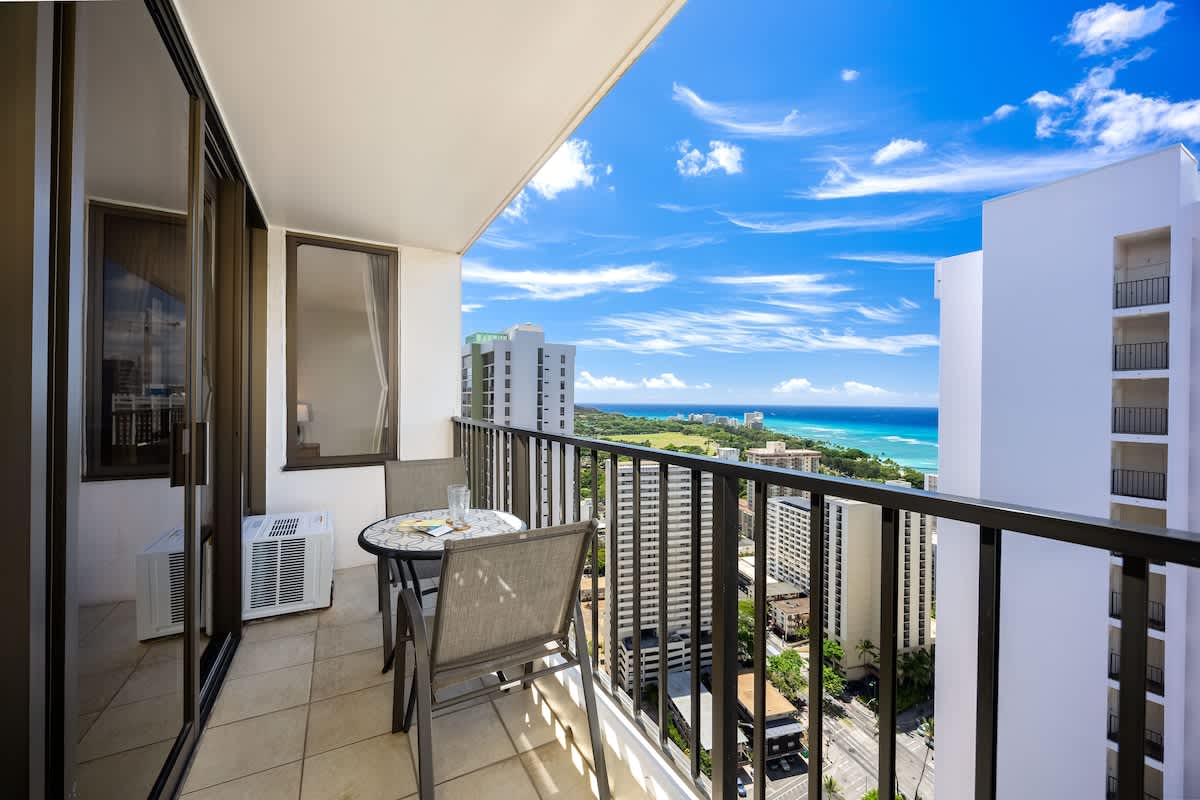This charming, newly renovated one-bedroom suite on the 35th floor offers a comfortable stay with a king bed, a sleeper sofa, and a full kitchen. You’ll love the free WiFi, A/C, included parking, and private lanai with stunning ocean views. Just a short stroll from Waikiki Beach, this is your perfect home base for exploring all the island has to offer.