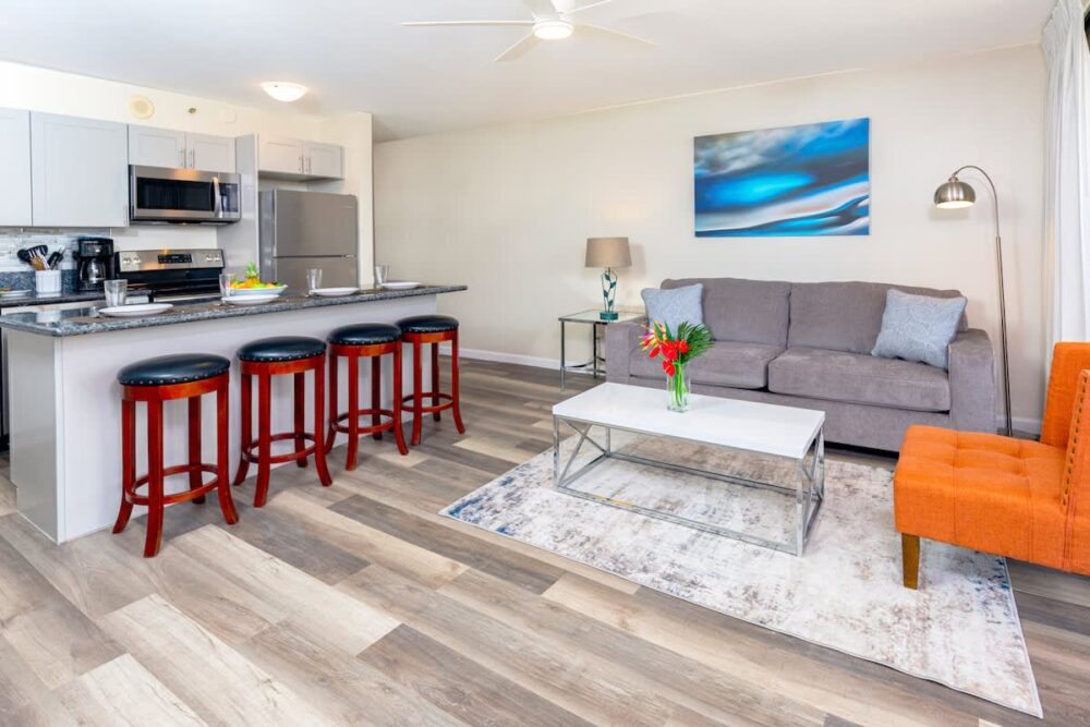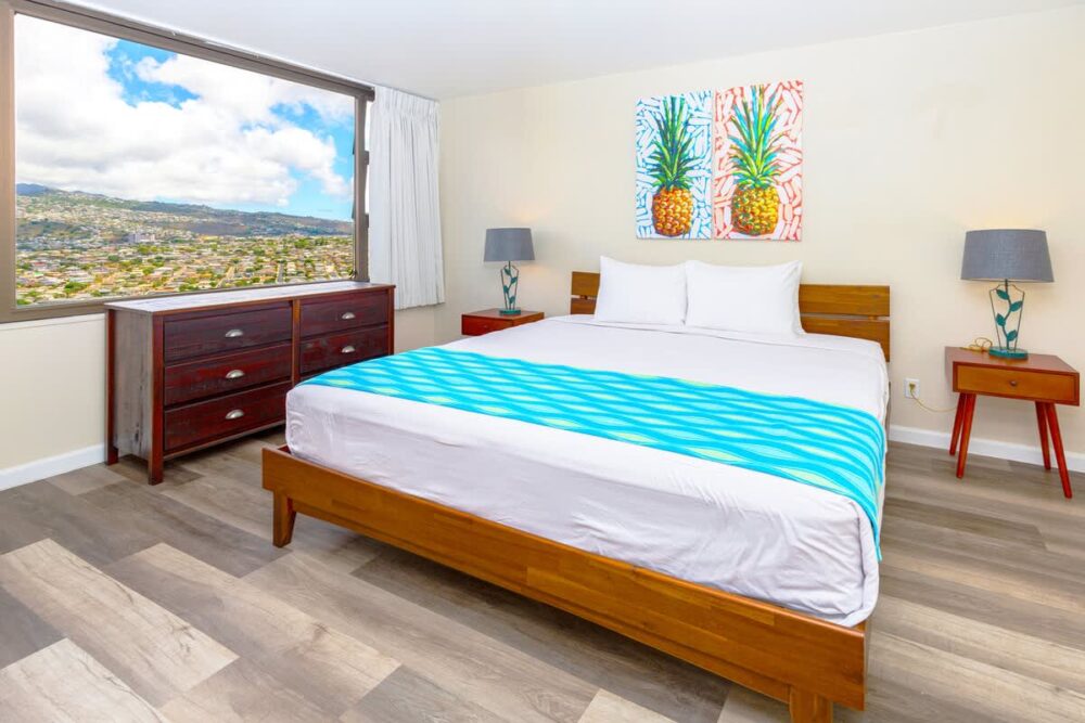 With your convenience and comfort in mind, this air-conditioned unit boasts an open floor plan seamlessly integrated with a fully equipped kitchen, complete with a countertop accompanied by 4 cozy barstools. The bedroom is furnished with a king-size bed perfect for relaxation. The living room area offers additional accommodation with a pull-out queen-size sleeper sofa and a 43″ flat-screen TV for your entertainment. The lanai offers stunning views of the mountains and the city. Completing the ensemble, this unit includes a full bathroom with a shower!