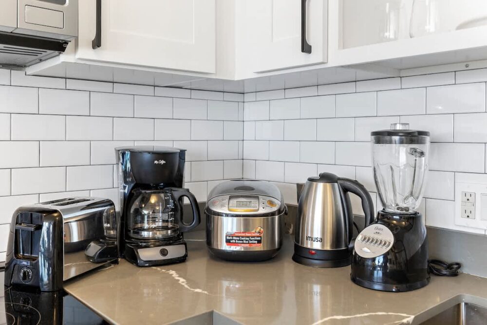 – Fully equipped with a toaster, coffee maker, rice cooker, blender, kettle, pots, pans, silverware, cookware, and dishes.