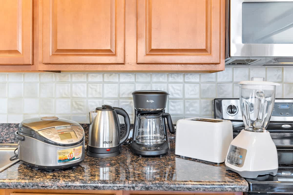 • Fully equipped with a toaster, coffee maker, rice cooker, blender, kettle, pots, pans, silverware, cookware, and dishes.