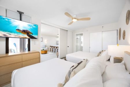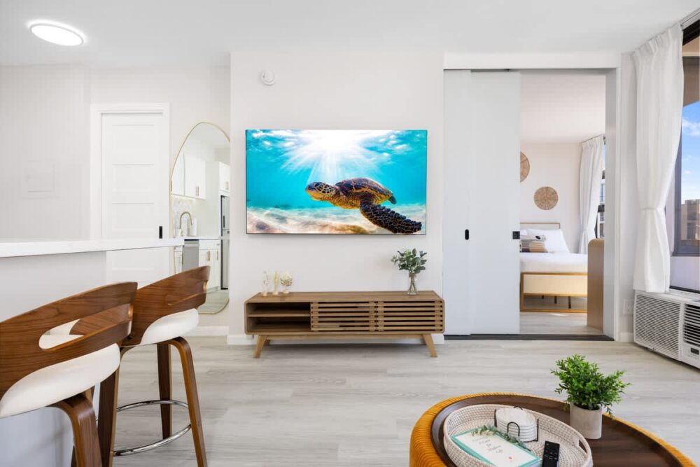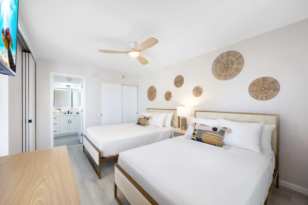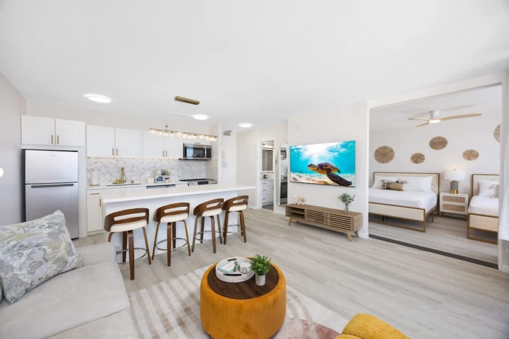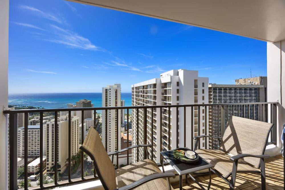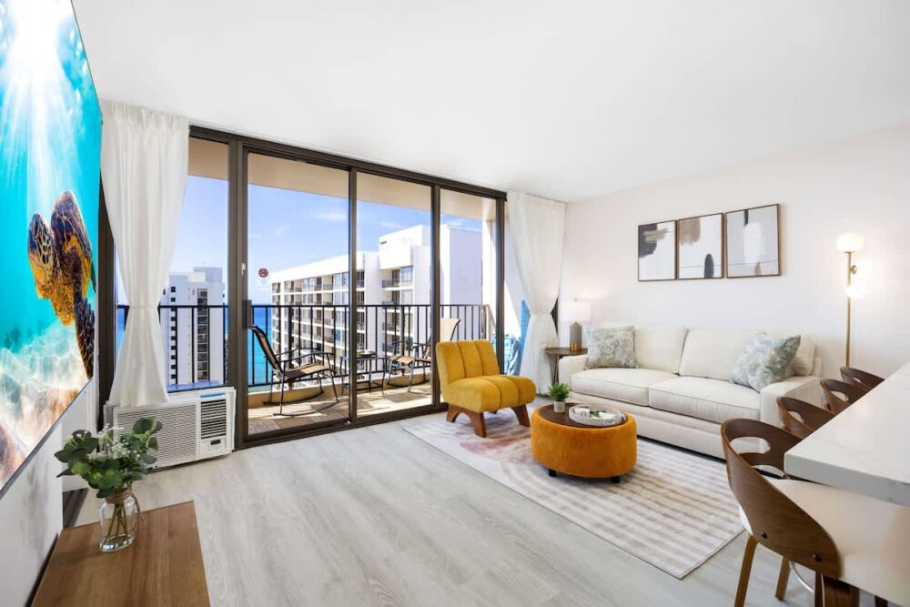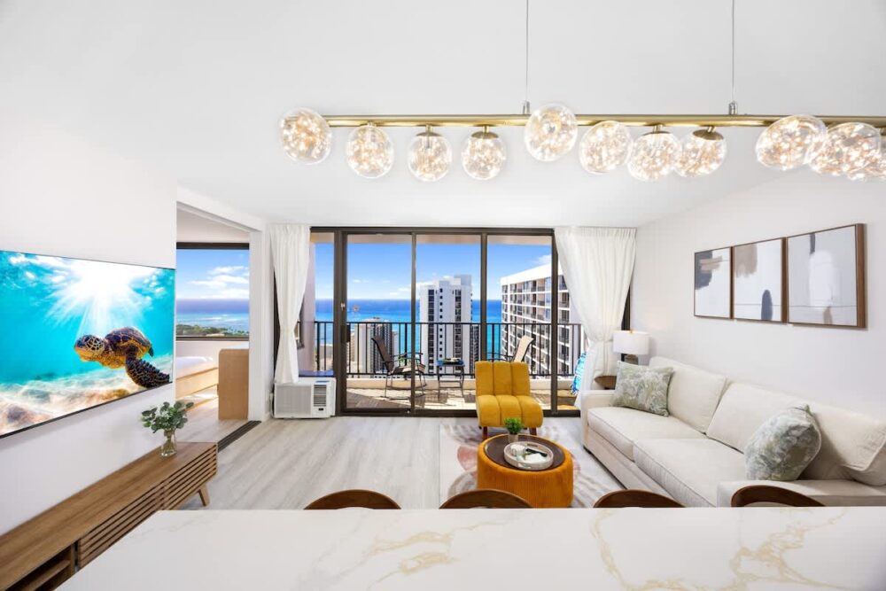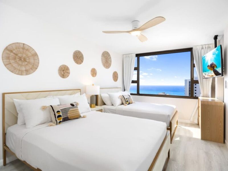 Escape to this newly renovated ocean-view condo on the 36th floor of Waikiki Banyan, perfect for up to 4 guests. Step out onto your private balcony to enjoy breathtaking ocean views, then unwind inside with a comfortable sleeping setup featuring 1 queen bed, 1 full bed, and a sofa bed. The unit includes a full kitchen, bathroom with a tub/shower combo, 65″ smart TV, window AC, free Wi-Fi, and free parking. Just steps from Waikiki Beach, the Honolulu Zoo, Kapiolani Park, and top shopping and dining, this high-floor retreat offers the perfect mix of comfort, convenience, and island charm!