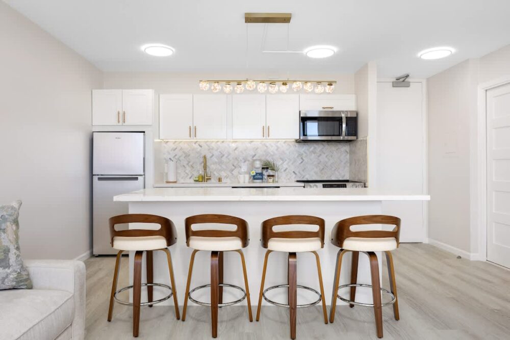 • Fully equipped with full-size appliances: microwave, stove, refrigerator with freezer, dishwasher