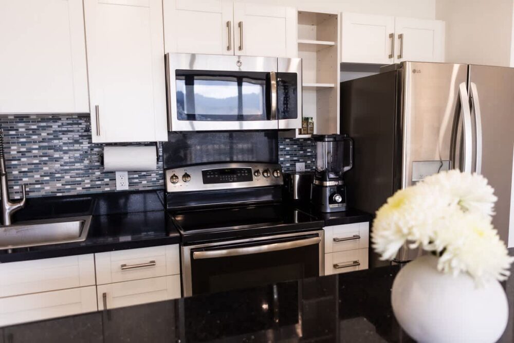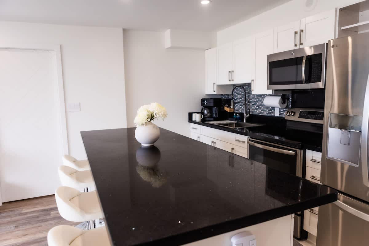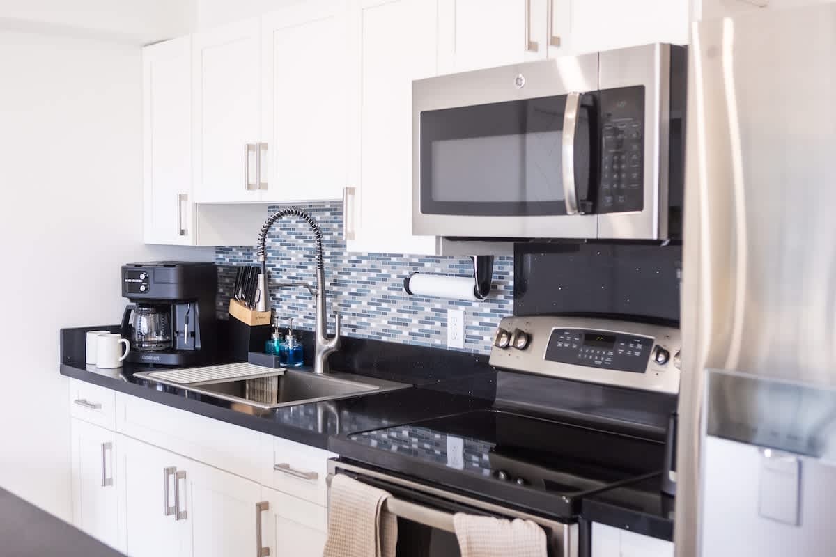 • Fully equipped with full-size appliances: microwave, stove, refrigerator with freezer
