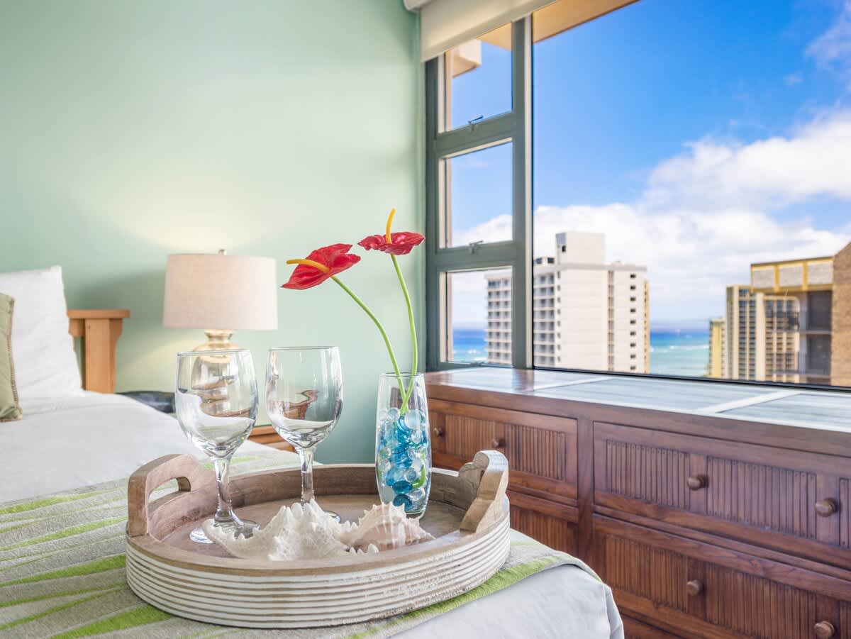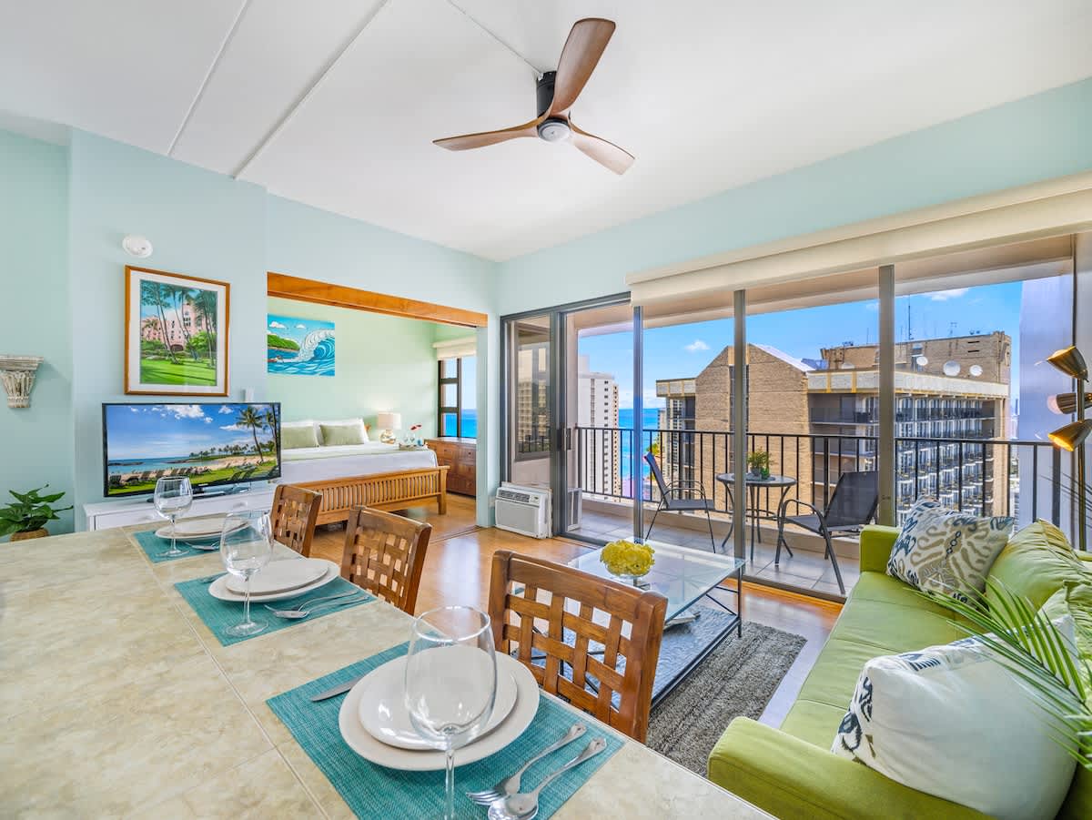 Experience the charm of our stylish 1-bedroom unit at the Condominium Hotel Waikiki Banyan, presented by Midway Vacations. This inviting space comfortably sleeps up to 4 guests and is perfectly situated within walking distance of Waikiki Beach, shopping, and dining. Enjoy complimentary parking, high-speed wireless internet, and breathtaking ocean and city views!