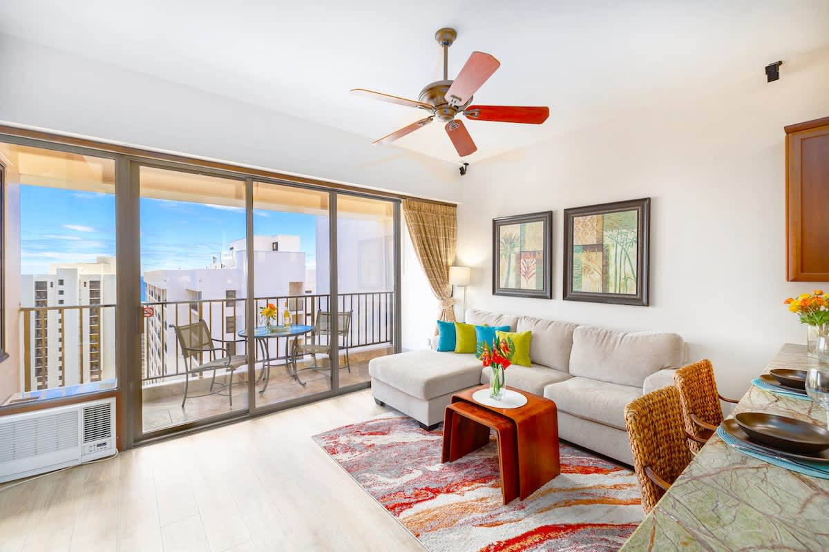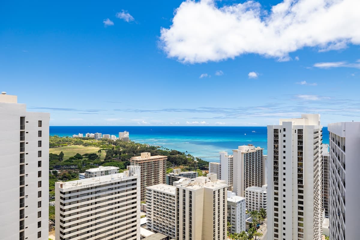 Enjoy your tropical getaway in this stylish 600 sq ft, 38th-floor condo at Waikiki Banyan, perfectly located in the heart of Waikiki and just a short walk to Waikiki Beach, dining, and entertainment. This south-facing one-bedroom unit features ocean views from the private lanai, a king bed, air conditioning, a fully equipped kitchen with dining for two, an L-shaped sofa, a 50″ Smart TV, and a tub/shower combo, offering a comfortable and convenient home base for your Hawaiian escape!
