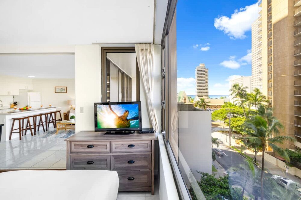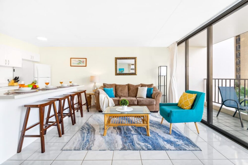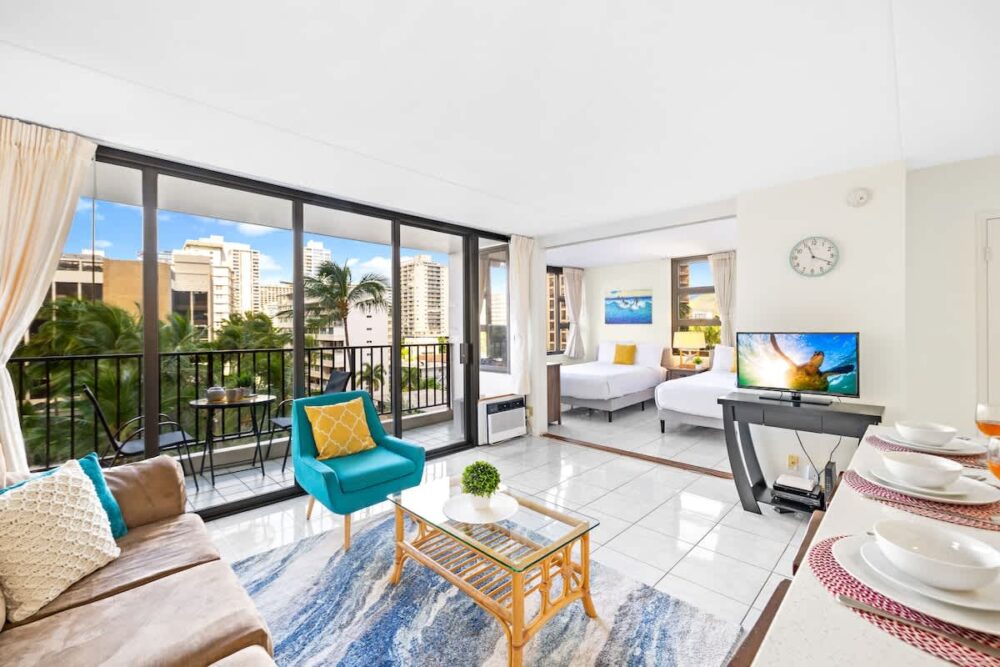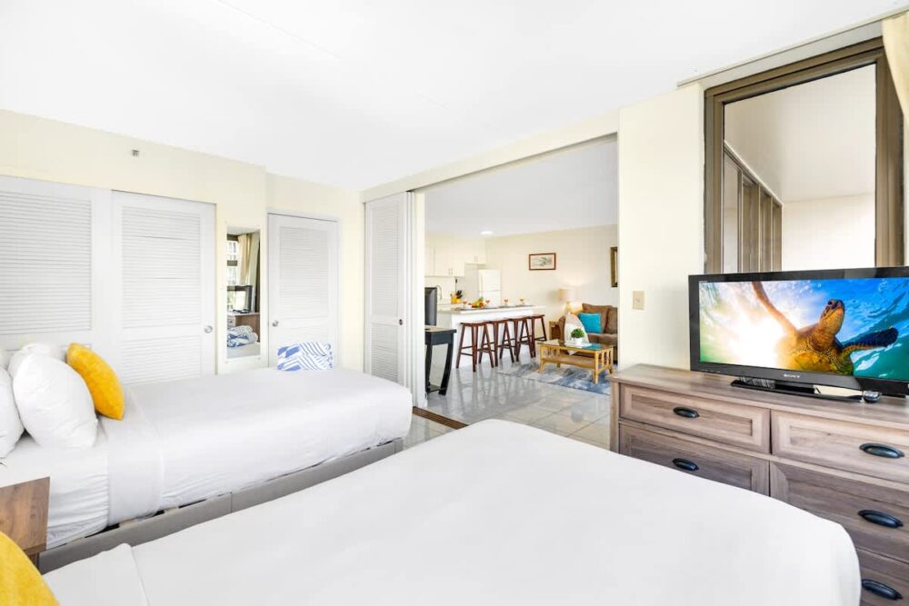 Experience the perfect Waikiki getaway in this 600 sq ft, beautifully renovated 7th-floor condo at the family-friendly Waikiki Banyan. Just steps from world-famous Waikiki Beach, top restaurants, shopping, and scenic Kapiolani Park, this suite offers city views, an open floor plan with a fully equipped kitchen, two full-size beds, a pull-out sleeper sofa, and a 32″ TV. It has everything you need for an unforgettable Hawaiian vacation!