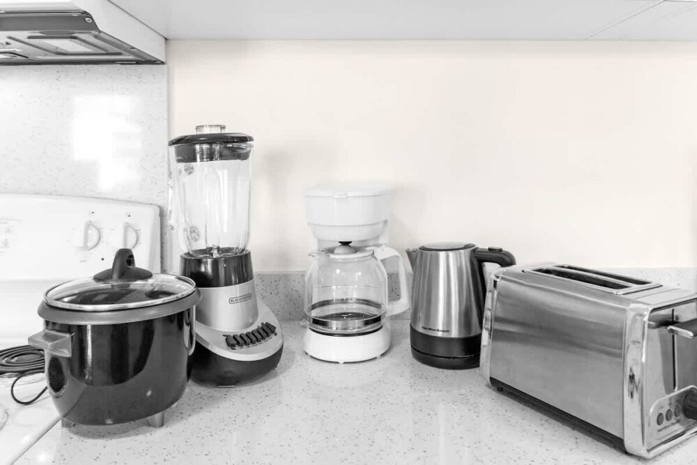 • Fully equipped with a toaster, coffee maker, rice cooker, blender, kettle, pots, pans, silverware, cookware, and dishes.