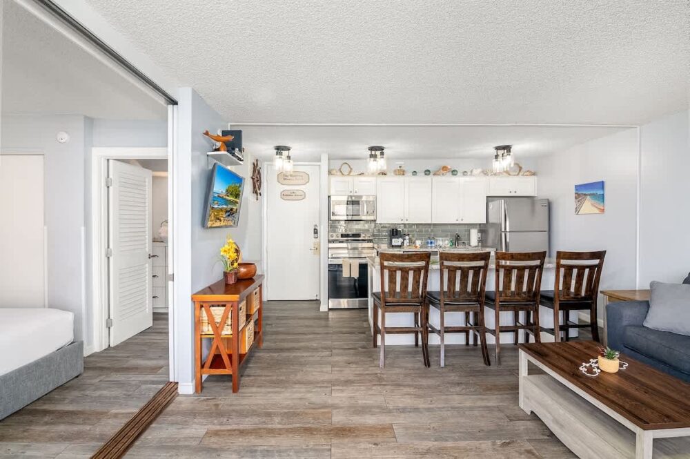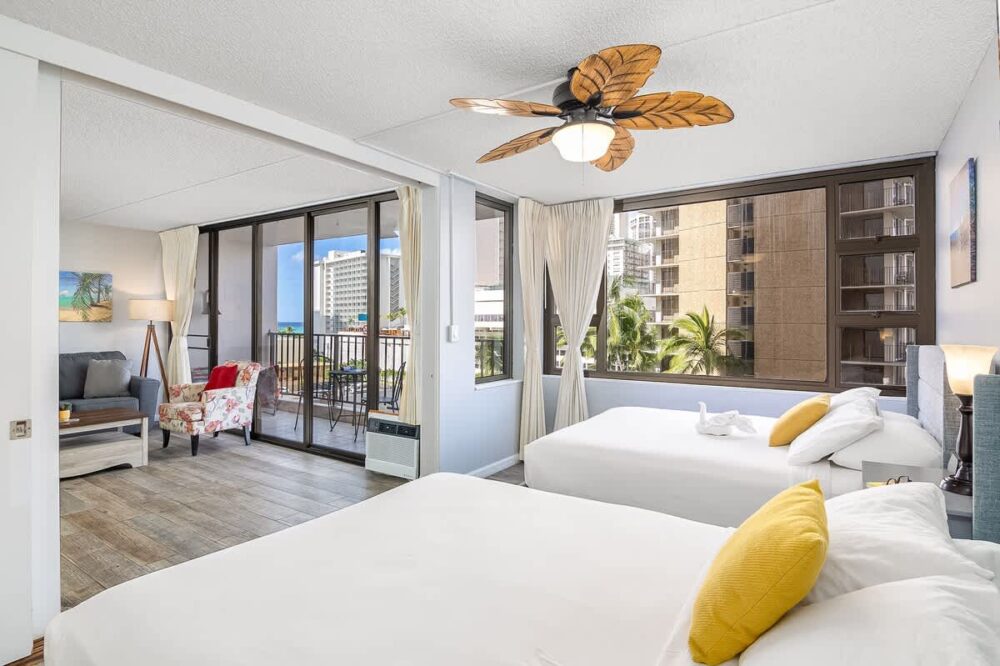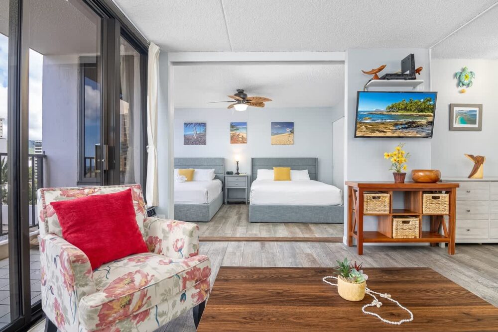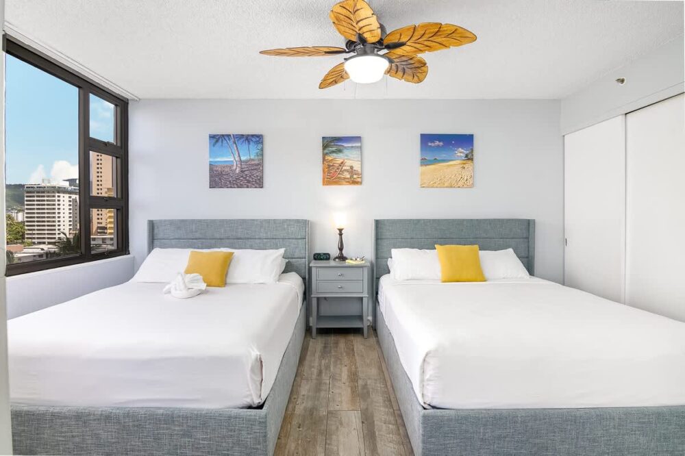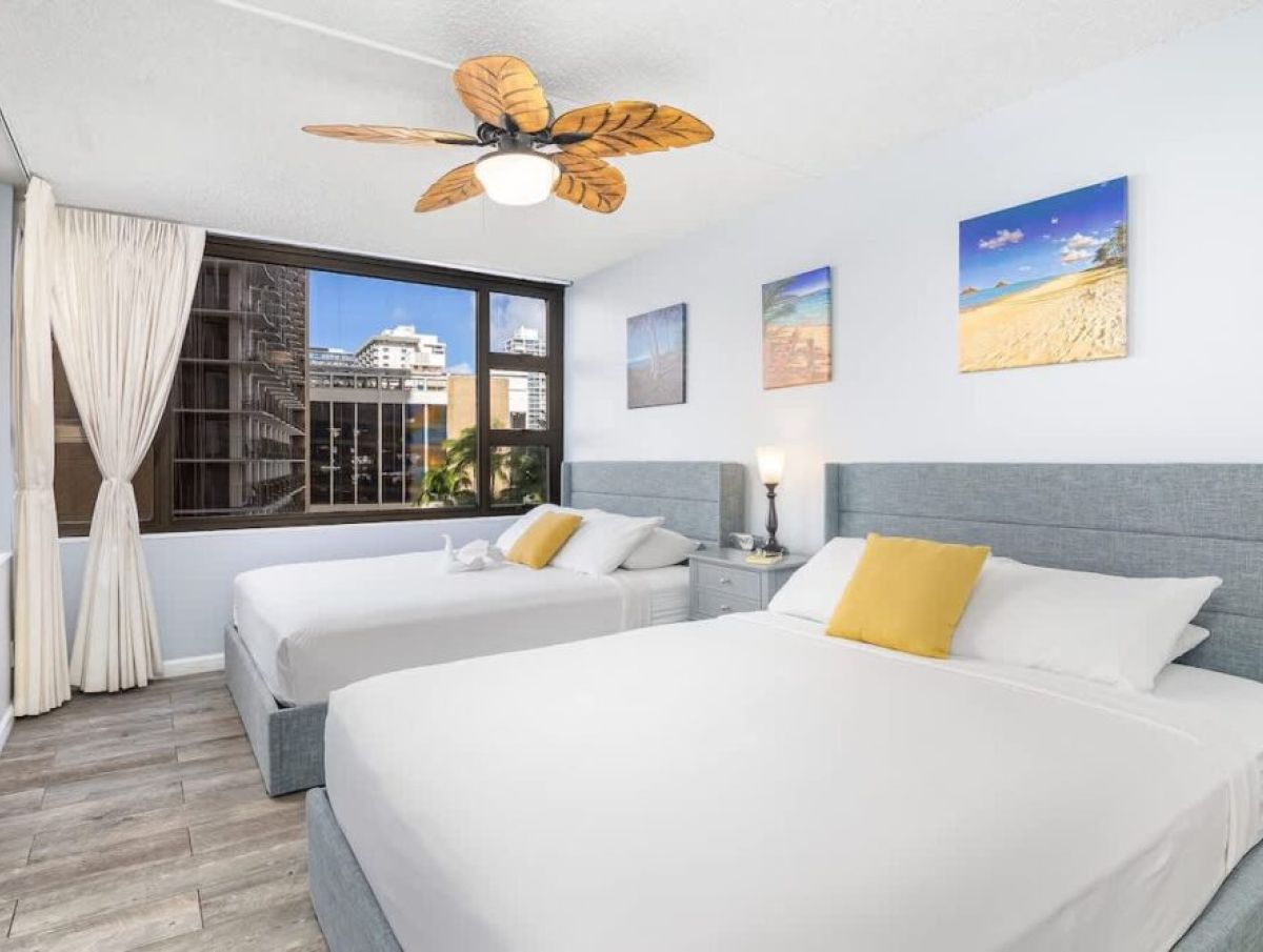 Enjoy a relaxing stay in this beautifully renovated 600 sq ft, 7th-floor condo at the family-friendly Waikiki Banyan, ideally located just one block from the golden sands and surf of Waikiki Beach. This west-facing, air-conditioned unit offers a warm and inviting atmosphere with an open floor plan, a fully equipped kitchen, and a dining counter for four. The bedroom features 2 queen beds, while the living area includes a sleeper sofa and a 40″ TV. A full bathroom with a tub and shower, fresh linens and beach towels, on-floor laundry access, free high-speed Wi-Fi, and complimentary parking complete this comfortable island retreat!