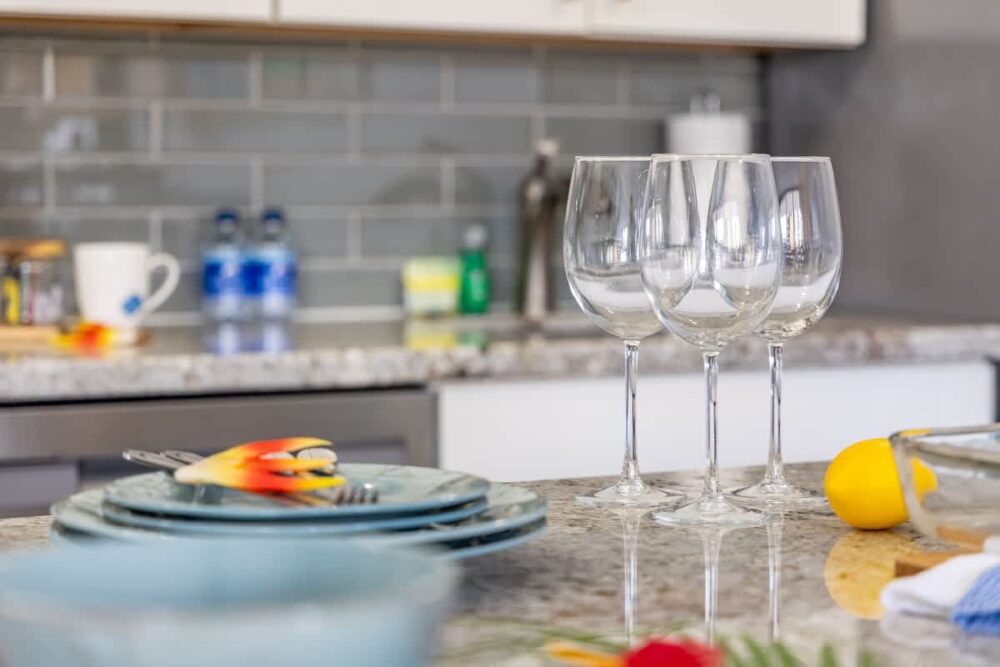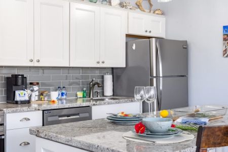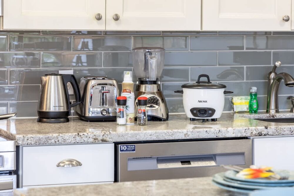 • Fully equipped with a toaster, coffee maker, rice cooker, blender, kettle, pots, pans, silverware, cookware, and dishes.