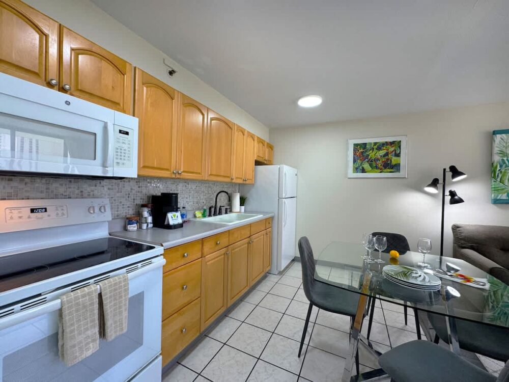 • Stocked with all the essentials: toaster, coffee maker, rice cooker, blender, kettle, pots, pans, cookware, dishes, and silverware