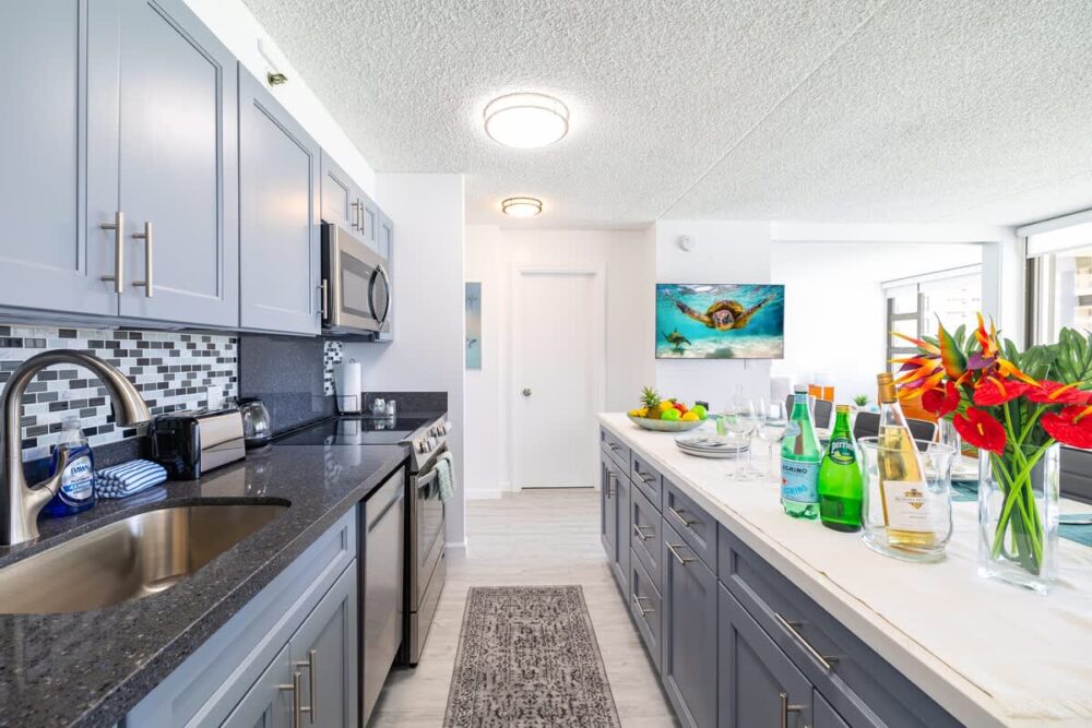 – Your very own Aloha Pack: coffee filters, salt and pepper, laundry detergent, dish soap and sponge, hand soap, shampoo/body wash/lotion set, toilet paper, paper towels, tissues, and cleaning supplies.