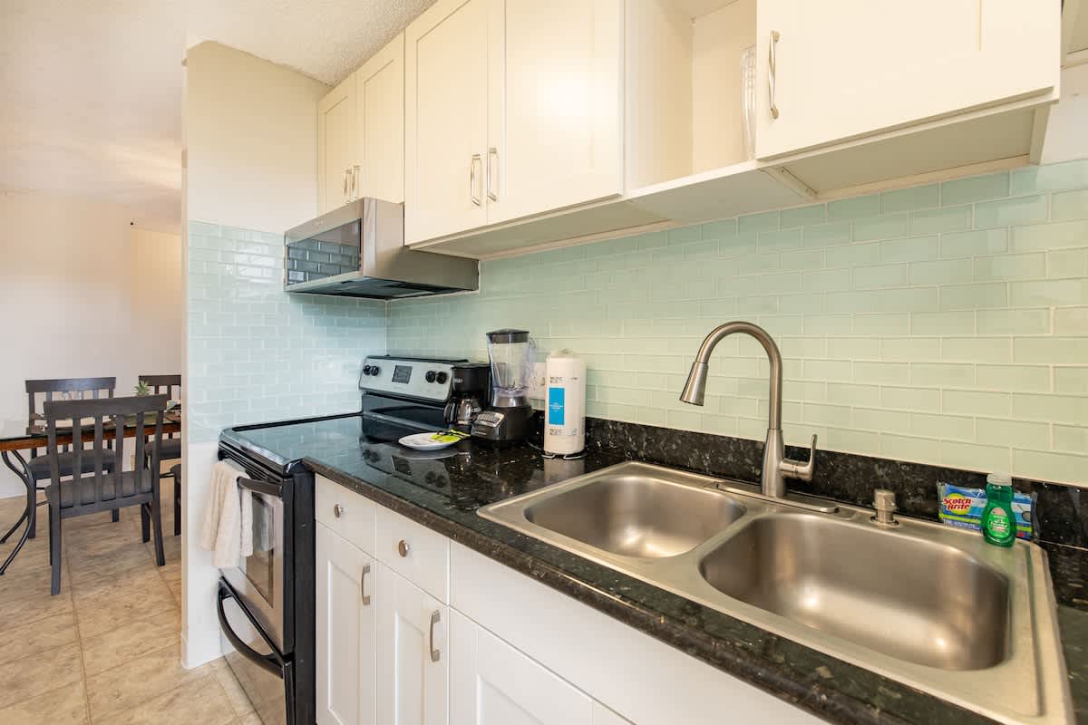 – Fully equipped with a toaster, coffee maker, rice cooker, blender, kettle, pots, pans, silverware, cookware, and dishes.