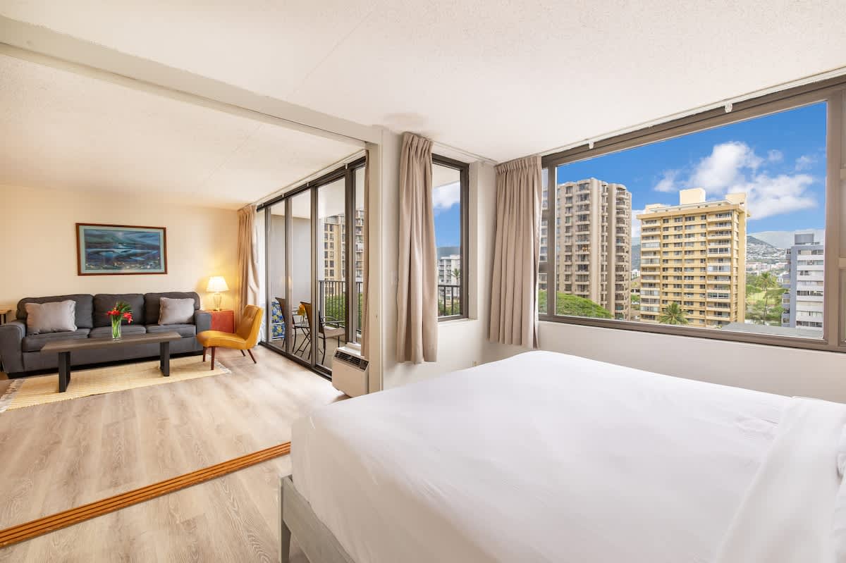 Lovely 1-bedroom suite nestled within the Condominium Hotel Waikiki Banyan brought to you by Midway Vacations, accommodating up to 4 guests. Just a stroll away from the stunning Waikiki Beach, as well as various shopping outlets and delightful restaurants. Enjoy the convenience of complimentary parking and high-speed wireless internet! Revel in picturesque mountain and city views from the bedroom and lanai, while the kitchen offers captivating views of Diamond Head!