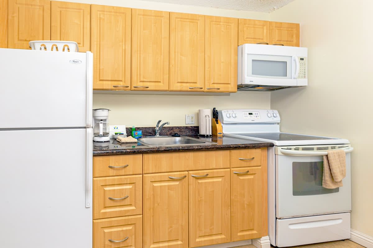 – Fully equipped kitchen with full-size refrigerator, microwave, and stove
