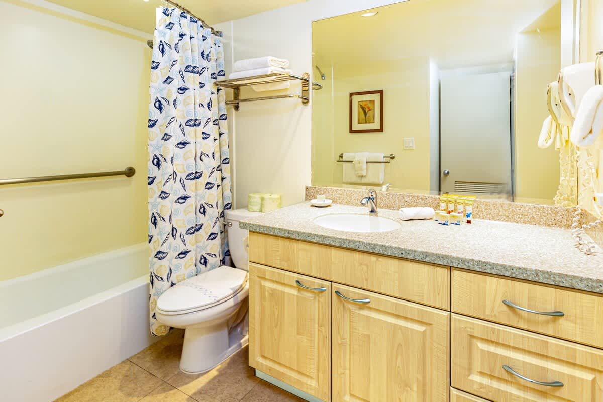 This cozy living space includes a large TV and pull-out sleeper sofa for your ultimate relaxation. This north-facing property is fully air-conditioned with central AC in both the living room and the bedroom and sports an open floor plan, with a fully-equipped kitchen for your convenience. This unit has it all, from top to bottom, and is a beloved favorite of all our guests from around the world. Relax in your king-size bed while watching TV after a long day spent in the sun, and embrace the laid-back island life. The full bathroom is spacious and up-to-date, making this unit perfect for your next island getaway.