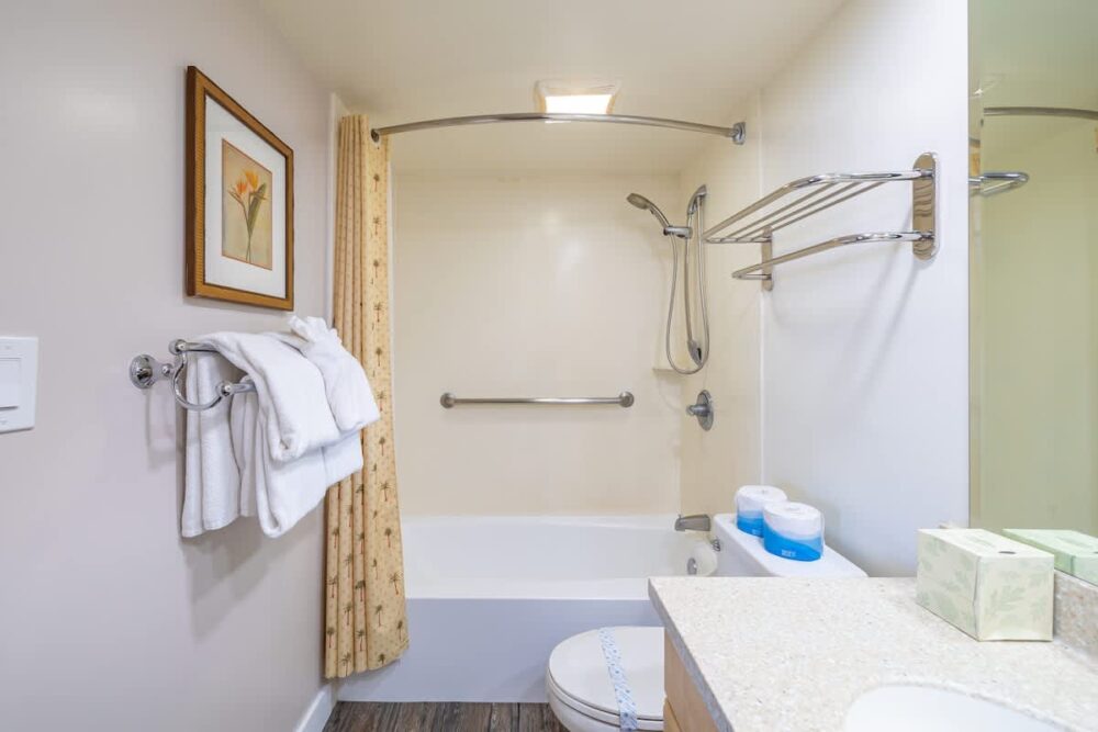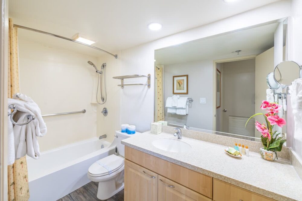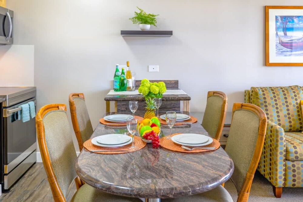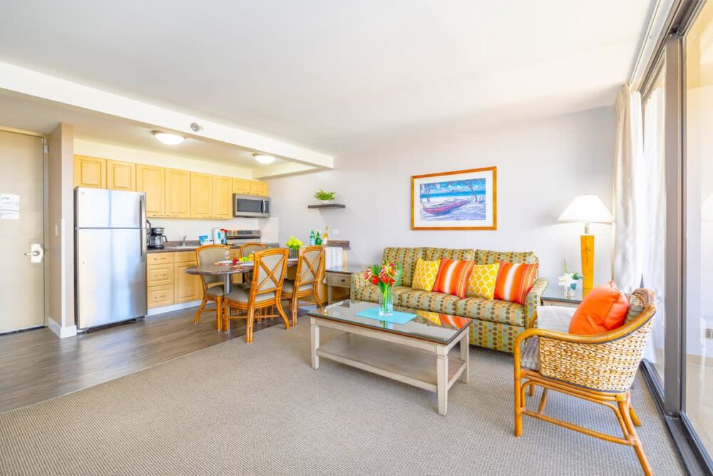 Feast your eyes on the living space, complete with a 43″ Flat-screen TV and queen-size sleeper sofa for your ultimate relaxation. This Southeast-facing property is fully air-conditioned with central AC in both the living room and the bedroom and sports an open floor plan and a fully stocked kitchen for your convenience. This unit has it all, from top to bottom, and has been a perennial favorite of all our guests from around the world.