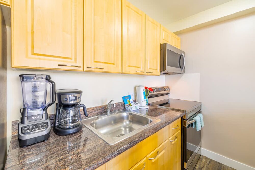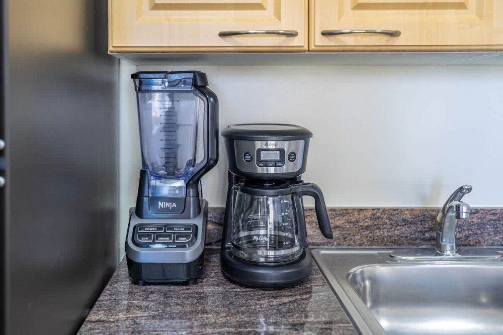 – Fully equipped with a toaster, coffee maker, rice cooker, blender, kettle, pots, pans, silverware, cookware, and dishes.