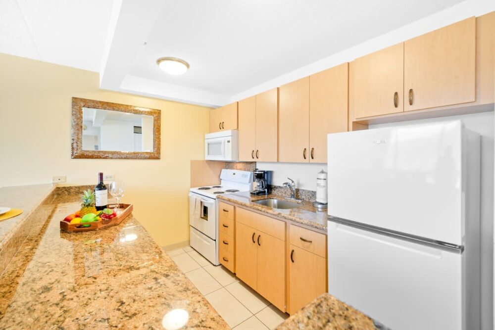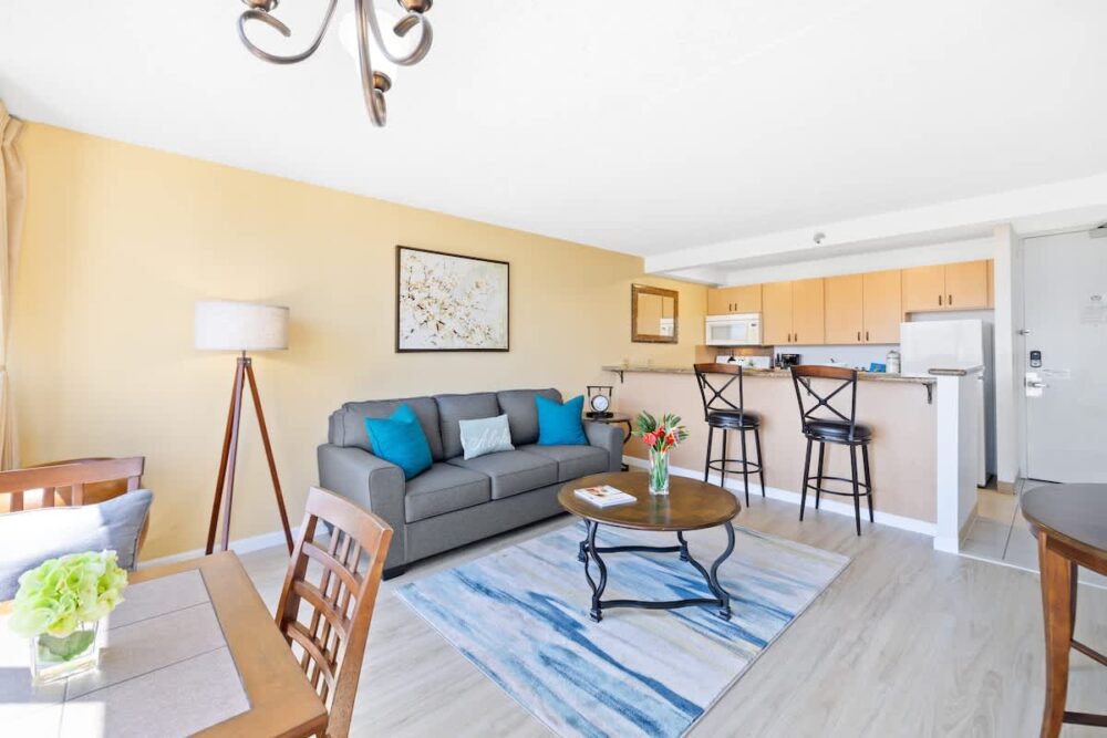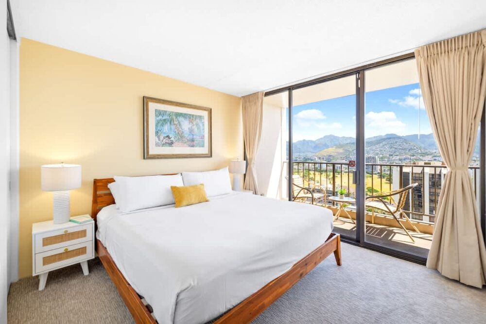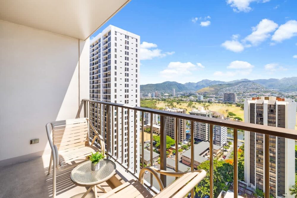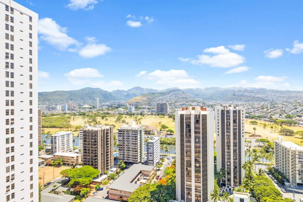 Enjoy stunning mountain views from this beautiful 28th-floor condo at the family-friendly Waikiki Sunset, just a 5-minute walk from Waikiki Beach. Relax on your private lanai or in the cozy living area with a 55″ Smart TV and queen sleeper sofa. The unit has an area of 540 sq ft plus a 55 sq ft lanai. It features central AC, a fully equipped kitchen, and a comfortable king-size bed. With a modern full bathroom, free Wi-Fi and parking, and easy access to nearby shops, restaurants, and attractions, it’s the perfect Waikiki getaway!