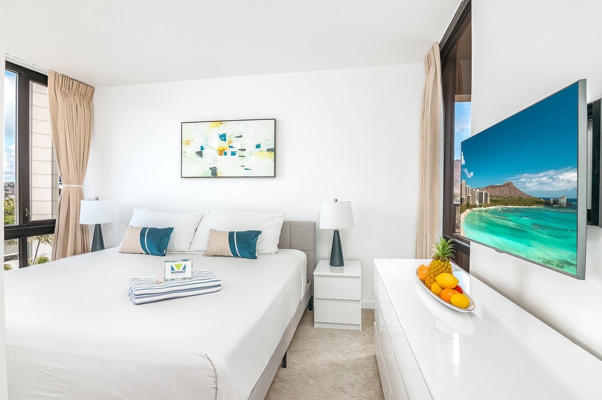 Enjoy breathtaking views of Diamond Head from this 9th-floor, newly renovated 2-bedroom condo in the heart of Waikiki, brought to you by Midway Vacations. Accommodating up to 5 guests, this inviting retreat is just a 5-minute stroll from the beach, popular dining spots, and vibrant shopping centers. Plus, enjoy the added perks of complimentary parking and high-speed Wi-Fi—everything you need for an unforgettable Hawaiian escape!